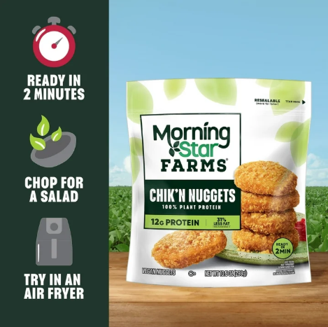 - Includes 1, 10.5oz resealable bag of frozen MorningStar Farms chik'n nuggets; Packaged for freshness and great taste