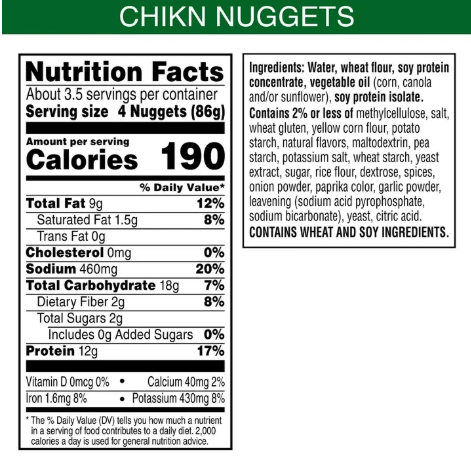- Plant based meat, MorningStar Farms chik'n nuggets are a delicious, chicken alternative to any balanced diet; Frozen