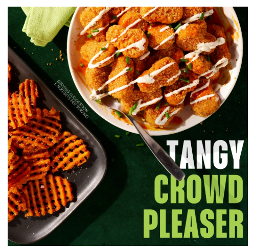 Spicy, buffalo-seasoned 100% plant-based nuggets with a crispy, crunchy breading outside and tender inside; Perfect for dipping; Ideal meat-free protein source