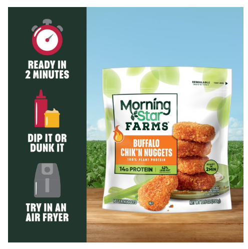 Includes 1, 10.5oz resealable bag of frozen MorningStar Farms Buffalo chik'n nuggets; Packaged for freshness and great taste