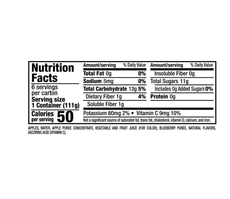 Apples, Water, Apple Puree Concentrate, Vegetable and Fruit Juice for Color, Blueberry Puree, Natural Flavors, Ascorbic Acid (Vitamin C)