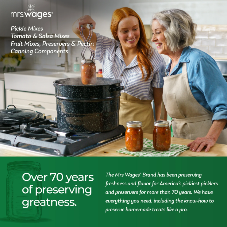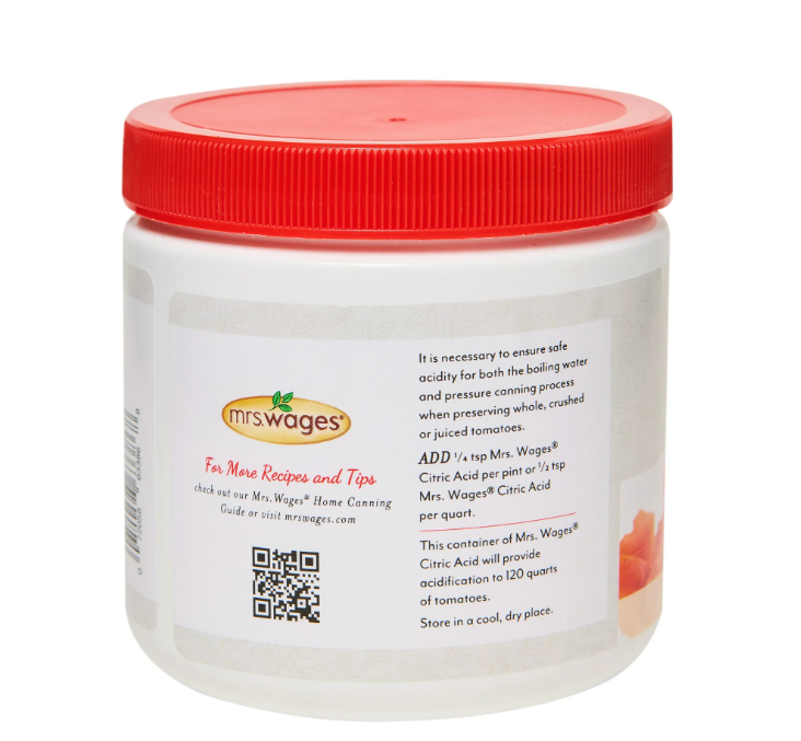 The USDA recommends the addition of citric acid to each jar of canned tomatoes to reduce potential botulism risk. For more information click here. Although tomatoes are generally thought of as high-acid fruits, a few varieties have higher known pH levels making them more susceptible to the spores of Clostridium botulinum. The addition of Mrs. Wages® Citric Acid raises the acidity and lowers the pH. To ensure safe acidity, add 1/2 teaspoon of citric acid to every quart of tomatoes (for pints, uses 1/4 teaspoon citric acid). Contents of this package will process approximately 50 quarts of tomatoes. If you love to share nature's bounty, you'll find a friend in Mrs. Wages. A full-flavored family of easy shelf stable mixes to enhance the fresh taste of your favorite foods...and that'll bring a smile to the people you care about!