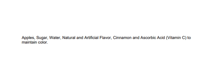 Apples, Sugar, Water, Natural and Artificial Flavors, Cinnamon and Ascorbic Acid (Vitamin C) to Maintain Color.
