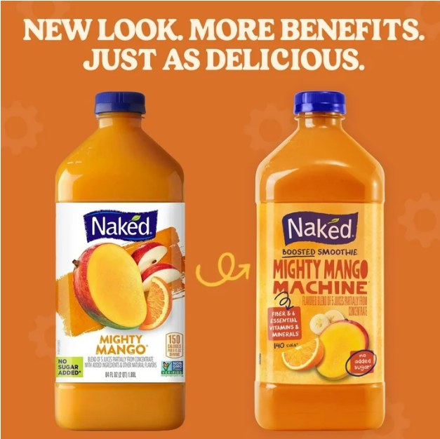 Get a boost with Naked Mighty Mango Machine Flavored Boosted Smoothie, featuring the same great taste you love with fiber and 6 essential vitamins and minerals. Bursting with real fruit, this satisfying mango smoothie is a perfect blend of fruits and juices from mango, banana, apples, orange and a hint of lemon for an irresistible smoothie. Each bottle of 100% juice Naked smoothie is an excellent source of vitamin C and vitamin E for immune support, plus vitamin B6 and vitamin B12. Made with no added sugar,* this gluten free and vegan** fruit smoothie brings you real fruit flavor. The smoothie bottle is ready to pour and easy to store in the fridge. Enjoy a fruit smoothie for a snack during your busy day, as breakfast smoothies for hectic mornings, enjoy a glass post workout, or use them in smoothie bowls for a creative, feel-good snack. Try the rest of our line-up including Pina Colada Machine, Strawberry Banana Machine, Blue Machine, Rainbow Machine and Green Machine. (*Not a low calorie food. See nutrition information for calorie and sugar content. **Visit our website for more information on our vegan claims.)