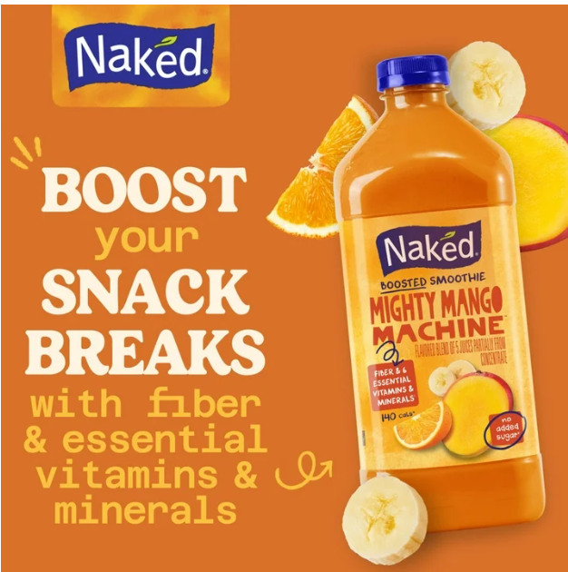 One (1) 64 fl oz bottle of Naked Mighty Mango Machine Flavored Boosted Smoothie, a fruit smoothie with fiber and 6 essential vitamins and minerals