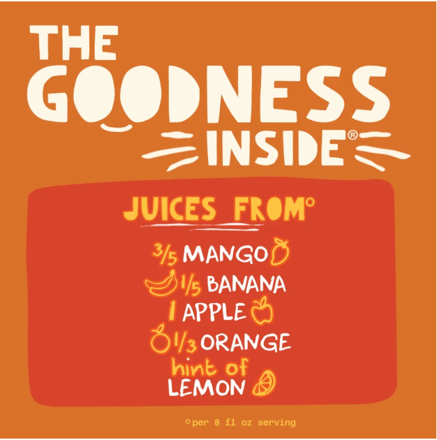 Mango Puree, Apple Juice from Concentrate (Water, Apple Juice Concentrate), Orange Juice, Banana Puree, Lemon Juice Inulin, Natural Flavor, Ascorbic Acid (Vitamin C), Beta-Carotene, Vitamin E Acetate, Niacinamide, D-Calcium Pantothenate (Vitamin B5), Pyridoxine Hydrochloride (Vitamin B6), Cyanocobalamin (Vitamin B12).
