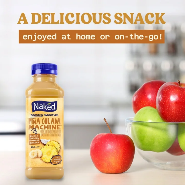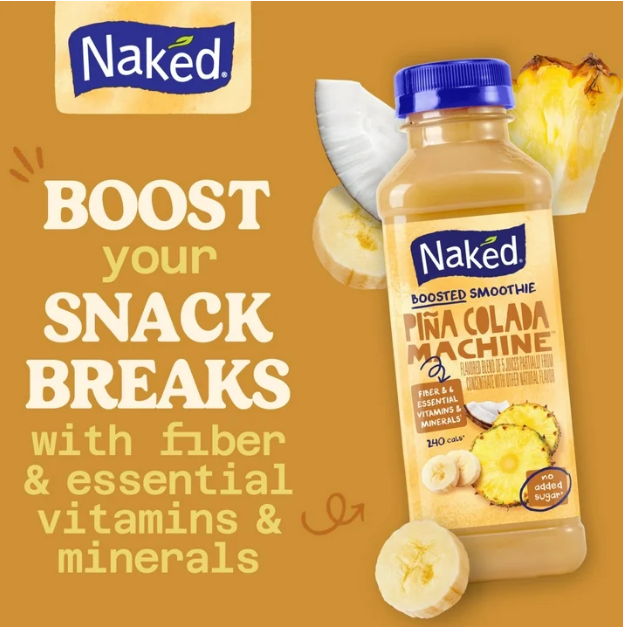 Get a boost with Naked Pina Colada Machine Flavored Boosted Smoothie, featuring the same great taste you love with fiber and 6 essential vitamins and minerals. Bursting with real fruit, this satisfying pina colada smoothie is a perfect blend of fruits and juices from pineapple, orange, banana, apples, a hint of lemon and coconut milk for an irresistible smoothie. Each bottle of 100% juice Naked smoothie is an excellent source of vitamin C and vitamin E for immune support, plus vitamin B6 and vitamin B12. Made with no added sugar,* this gluten free and vegan** fruit smoothie brings you real fruit flavor in a convenient, deliciously portable bottle. The single serve smoothie bottle is ready to drink and easy to store in the fridge, cooler or in lunch boxes. Enjoy them on-the-go for a snack during your busy day, as breakfast smoothies for hectic mornings, pack them in your gym bag to enjoy post workout, or use them in smoothie bowls for a creative, feel-good snack. Try the rest of our line-up including Mighty Mango Machine, Strawberry Banana Machine, Blue Machine, Rainbow Machine and Green Machine. (*Not a low calorie food. See nutrition information for calorie and sugar content. **Visit our website for more information on our vegan claims.)