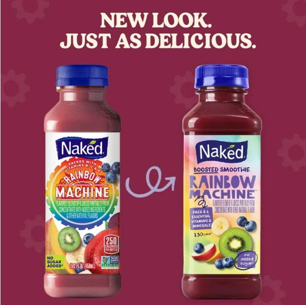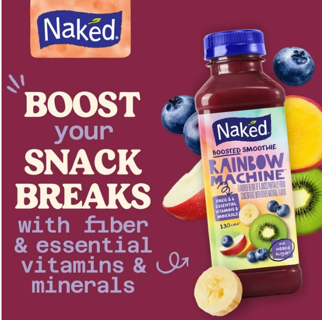 Get a boost with Naked Rainbow Machine Flavored Boosted Smoothie, featuring the same great taste you love with fiber and 6 essential vitamins and minerals. Bursting with real fruit, this satisfying rainbow smoothie is a perfect blend of fruits and juices from apples, red beet, kiwi, mango, banana and blueberries for an irresistible smoothie. Each bottle of 100% juice Naked smoothie is an excellent source of vitamin C and vitamin E for immune support, plus vitamin B6 and vitamin B12. Made with no added sugar,* this gluten free and vegan** fruit smoothie brings you real fruit flavor in a convenient, deliciously portable bottle. The single serve smoothie bottle is ready to drink and easy to store in the fridge, cooler or in lunch boxes. Enjoy them on-the-go for a snack during your busy day, as breakfast smoothies for hectic mornings, pack them in your gym bag to enjoy post workout, or use them in smoothie bowls for a creative, feel-good snack. Try the rest of our line-up including Mighty Mango Machine, Strawberry Banana Machine, Blue Machine, Pina Colada Machine and Green Machine. (*Not a low calorie food. See nutrition information for calorie and sugar content. **Visit our website for more information on our vegan claims.)
