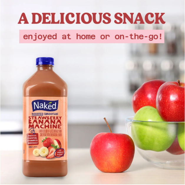 Get a boost with Naked Strawberry Banana Machine Flavored Boosted Smoothie, featuring the same great taste you love with fiber and 6 essential vitamins and minerals. Bursting with real fruit, this satisfying strawberry banana smoothie is a perfect blend of fruits and juices from strawberries, banana, apples and a hint of orange for an irresistible smoothie. Each bottle of 100% juice Naked smoothie is an excellent source of vitamin C and vitamin E for immune support, plus vitamin B6 and vitamin B12. Made with no added sugar,* this gluten free and vegan** fruit smoothie brings you real fruit flavor. The smoothie bottle is ready to pour and easy to store in the fridge. Enjoy a fruit smoothie for a snack during your busy day, as breakfast smoothies for hectic mornings, enjoy a glass post workout, or use them in smoothie bowls for a creative, feel-good snack. Try the rest of our line-up including Mighty Mango Machine, Pina Colada Machine, Blue Machine, Rainbow Machine and Green Machine. (*Not a low calorie food. See nutrition information for calorie and sugar content. **Visit our website for more information on our vegan claims.)