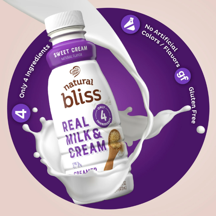 - Natural Bliss liquid creamer is gluten free and carrageenan free with no oils, gums, artificial colors or artificial flavors