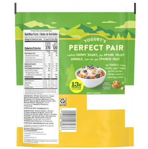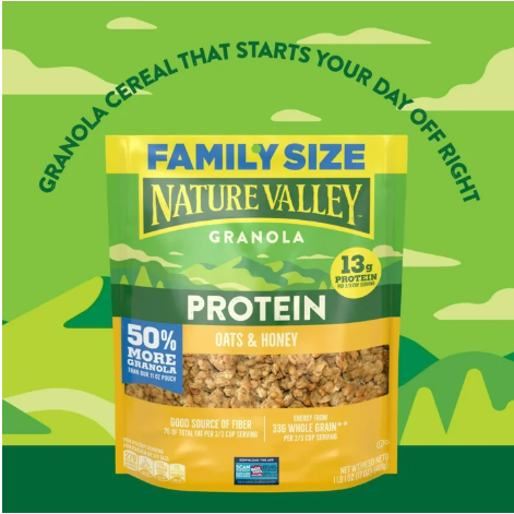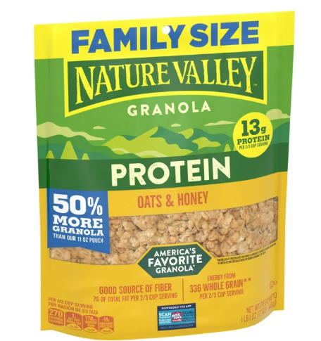 Fuel your adventures any time, any place with Nature Valley Protein Oats and Honey Granola, America's favorite granola.* The taste of sweet honey and the goodness of granola made with whole grain oats are a wholesome way to kick-start your day. This family size pouch has 50% more granola than our 11 oz pouch. Each 2/3 cup serving provides 13g of protein and energy from 33g whole grain (at least 48g recommended daily), plus a good source of fiber (7g of total fat per 2/3 cup serving). Plus, the crunchy oats and honey granola clusters have no artificial flavors or colors, and no high fructose corn syrup. So whether you enjoy a bowlful as a breakfast cereal or take along the pouch for family snacks on the run, this honey granola mix delivers on the go energy. Add your own fruit and nut combination for DIY trail mix. Sprinkle the Nature Valley granola clusters over a yogurt parfait or acai bowl for serious crunch. This pouch of loose granola cereal is resealable for easy school snacks or part of breakfast on the go. At Nature Valley, we believe that what you put in is what you get out. So wherever the moment takes you and your family, you can rely on our great-tasting snacks to help keep you going, whenever and wherever you need it. Contains one plastic pouch of crunchy Nature Valley Protein Oats and Honey Granola, Family Size, 17 oz; perfect for instant snacking, or a part of breakfast and meals. *Nature Valley Protein Oats and Honey is America's favorite granola based on 52 weeks of Nielsen Sales Data for granola ending 2/10/2025.