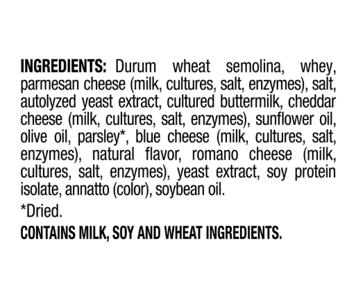 DURUM WHEAT SEMOLINA, WHEY, PARMESAN CHEESE (MILK, CULTURES, SALT, ENZYMES), SALT, AUTOLYZED YEAST EXTRACT, CULTURED BUTTERMILK, CHEDDAR CHEESE (MILK, CULTURES, SALT, ENZYMES), SUNFLOWER OIL, OLIVE OIL, PARSLEY*, BLUE CHEESE (MILK, CULTURES, SALT, ENZYMES), NATURAL FLAVOR, ROMANO CHEESE (MILK, CULTURES, SALT, ENZYMES), YEAST EXTRACT, SOY PROTEIN ISOLATE, ANNATTO (COLOR), SOYBEAN OIL. CONTAINS MILK, SOY AND WHEAT INGREDIENTS.