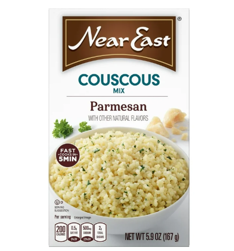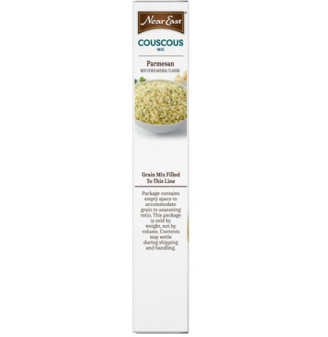 Near East Couscous Mix in Parmesan flavor is a quick and easy side dish made with 100% semolina wheat, Parmesan cheese, olive oil, and parsley. This 5.9 oz package offers a delicious, cheesy flavor and a light, fluffy texture. Perfectly seasoned, it pairs well with a variety of main courses and adds a gourmet touch to any meal. Enjoy the balance of flavor and convenience with Near East Couscous Mix. Allergen Statement: Contains Milk, Soy, and Wheat Ingredients. Shelf-Stable, regular size cardboard box.