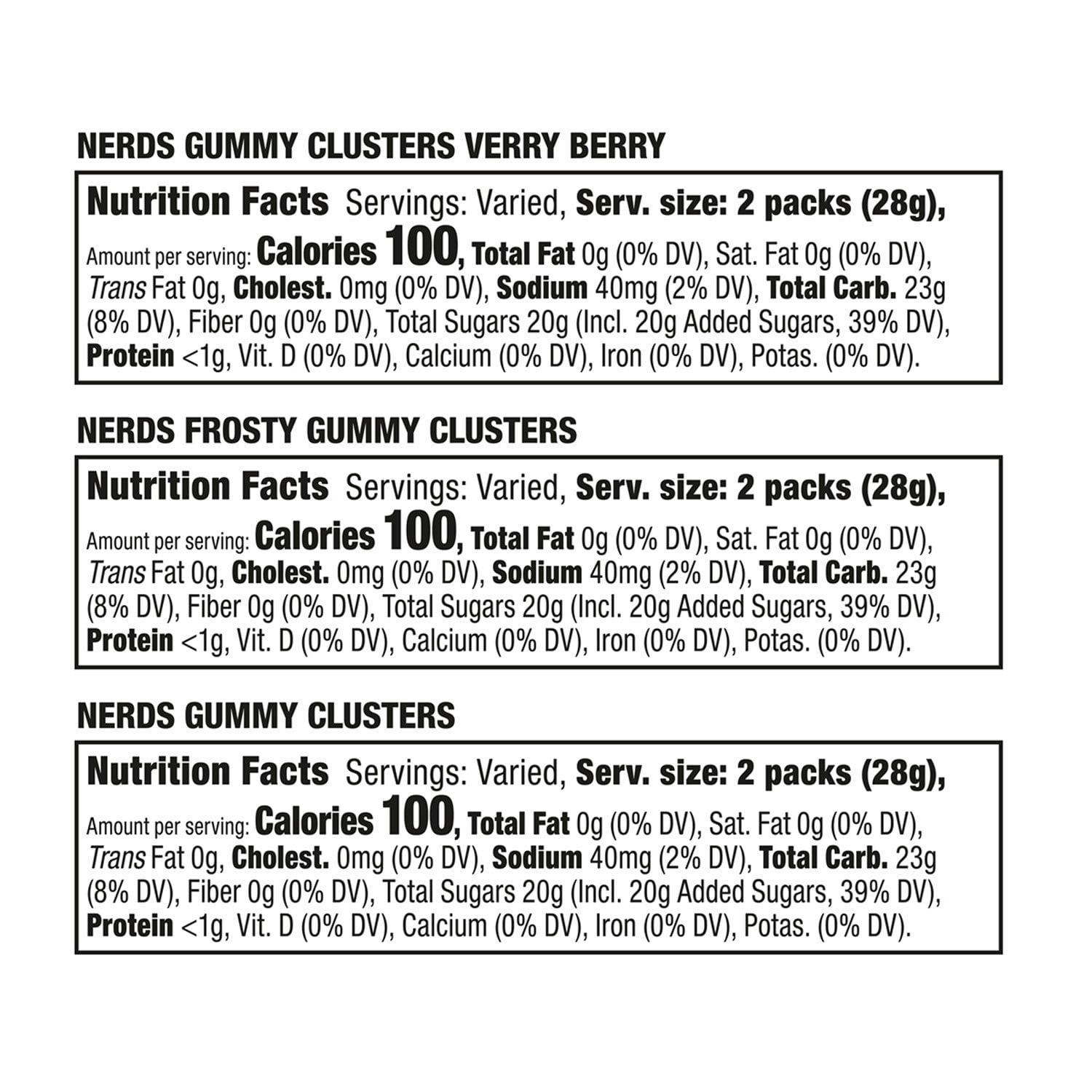 Nerds Gummy Clusters Verry Berry Ingredients: Corn Syrup, Sugar, Dextrose, Gelatin, Modified Food Starch, Water, Contains 2% Or Less Of Malic Acid (Dl-Malic Acid), Citric Acid, Sodium Citrate, Apple Juice Concentrate, Gum Arabic, Natural And Artificial Flavors, Carnauba Wax, Color Added, Blue 1, Red 40, Red 40 Lake, Blue 2 Lake, Carmine (Color), Blue 1 Lake, Yellow 5 Lake.