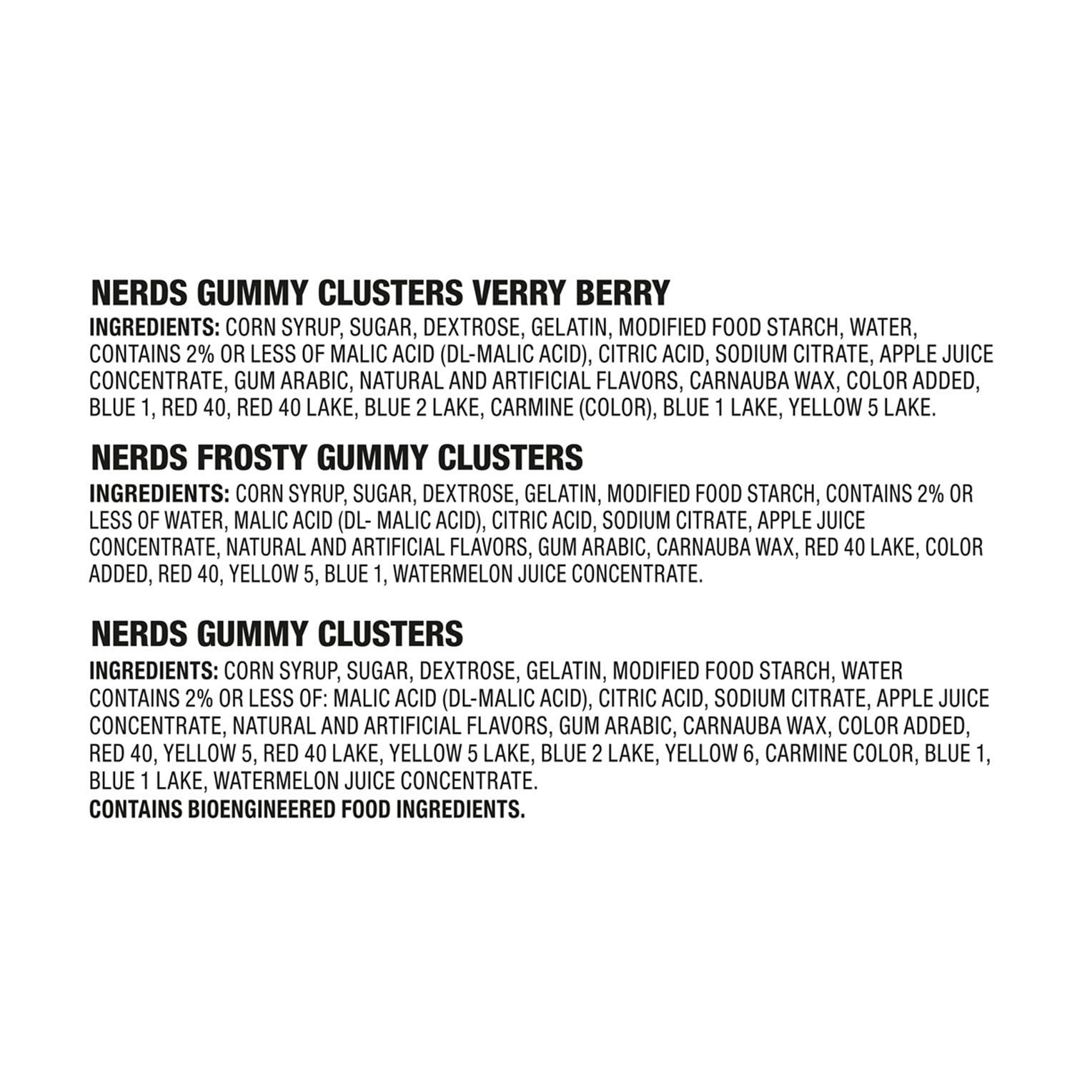Nerds Frosty Gummy Clusters Ingredients: Corn Syrup, Sugar, Dextrose, Gelatin, Modified Food Starch, Contains 2% Or Less Of Water, Malic Acid (Dl- Malic Acid), Citric Acid, Sodium Citrate, Apple Juice Concentrate, Natural And Artificial Flavors, Gum Arabic, Carnauba Wax, Red 40 Lake, Color Added, Red 40, Yellow 5, Blue L, Watermelon Juice Concentrate.