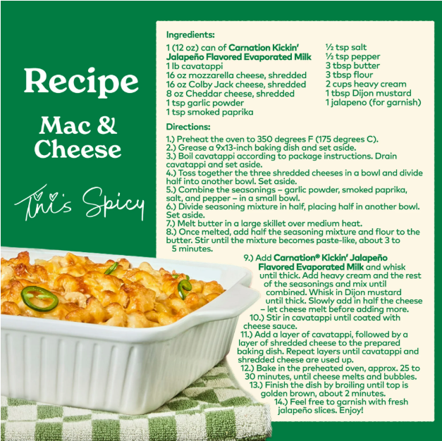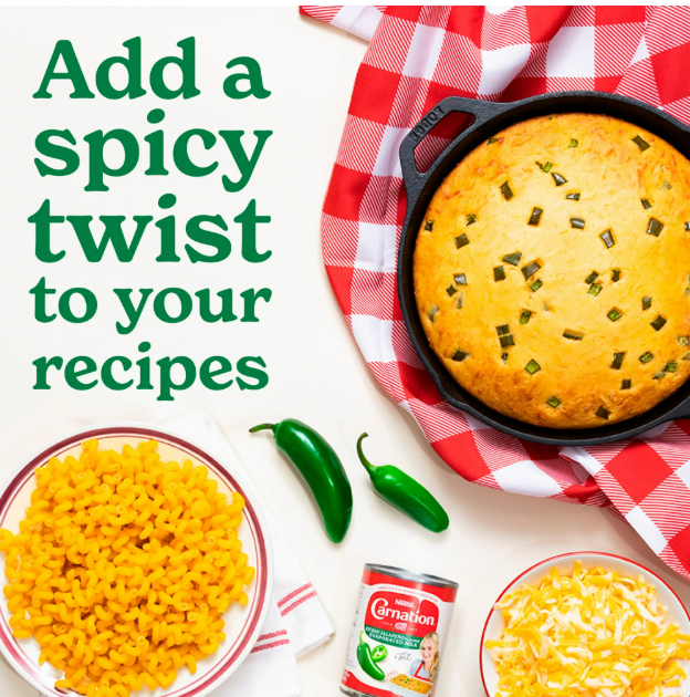 ADD A TWIST TO TRADITION: Whether you're hosting friends or trying viral food trends from TikTok, this Kickin’ Jalapeño flavored Carnation Evaporated milk brings bold inspiration to the table. It’s a simple, flavorful way to put your signature spin on comfort food classics, and share richer moments with loved ones