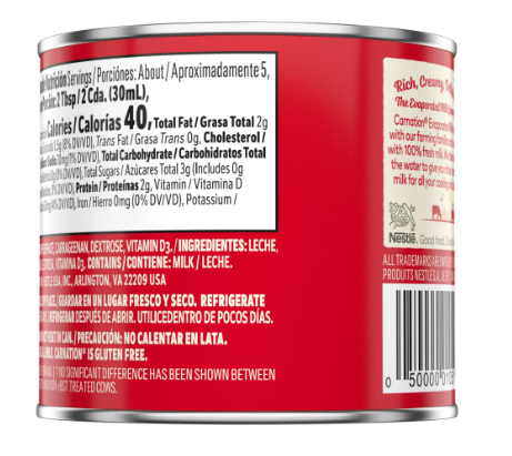 Discover the rich and creamy versatility of Nestlé Carnation Evaporated Milk, your go-to cooking milk for culinary delights. Crafted with the highest quality ingredients, Carnation Evaporated Milk is a milk with half the water removed, resulting in a creamy texture that enhances both sweet and savory recipes. Carnation Evaporated Milk is ideal for creating indulgent dishes such as mac and cheese, mashed potatoes, flan, tres leches, pies, and fudge. Conveniently packaged in a recyclable metal can, Carnation milk is designed for long shelf life, making it a practical addition to your pantry. Simply shake well before use, refrigerate after opening, and consume within a few days. Store in a cool, dry place to maintain its freshness and quality.