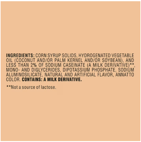 Ingredients: corn syrup solids, hydrogenated vegetable oil (coconut and/or palm kernel and/or soybean), and less than 2% of sodium caseinate (a milk derivative) ** mono- and diglycerides, dipotassium phosphate, sodium aluminosilicate, natural and artificial flavor, annatto color. ** not a source of lactose.