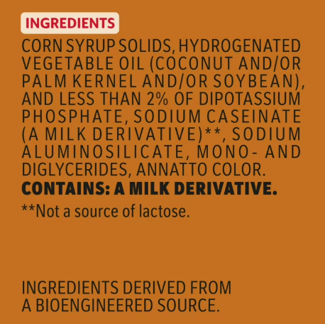 Ingredients: Corn Syrup Solids, Hydrogenated Vegetable Oil (Coconut and/or Palm Kernel and/or Soybean), and Less than 2% of Sodium Caseinate (a Milk Derivative)**, Mono- and Diglycerides, Dipotassium Phosphate, Sodium Aluminosilicate, Natural and Artificial Flavor, Annatto Color. **Not a source of lactose. Ingredients derived from a bioengineered source.