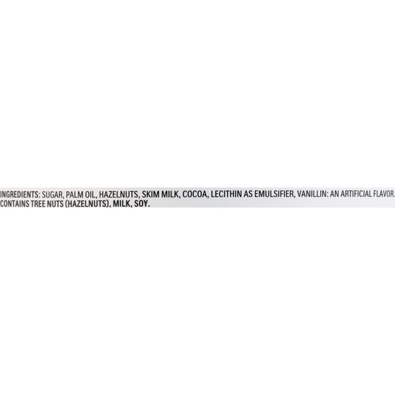 Sugar, Palm Oil, Hazelnuts, Skim Milk, Cocoa, Lecithin as Emulsifier, Vanillin: An Artificial Flavor.Contains Tree Nuts (Hazelnuts), Milk, Soy.
