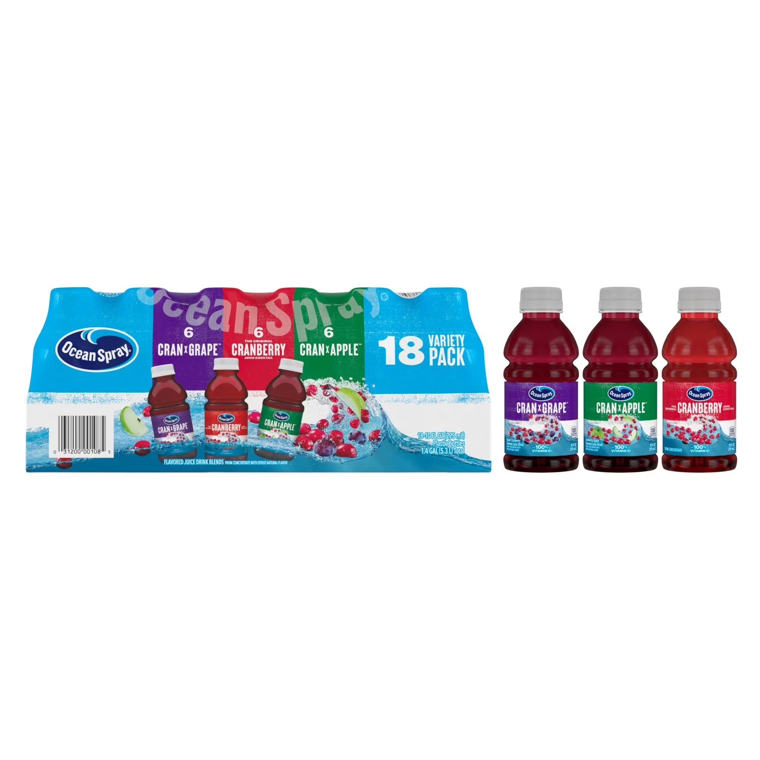 This variety pack contains 18 10-ounce bottles of fruity Ocean Spray drinks: six Original Cranberry Juice Cocktail bottles, six Cran-Grape® bottles, and six Cran-Apple bottles. Each drink is made with real fruit juice and provides 100% of your daily vitamin C needs per serving. Plus, these drinks are made without high fructose corn syrup. Ocean Spray has been a farmer-owned company since 1930, with 100% of its profits going back to the farmers who cultivate the juicy, perfect cranberries in each bottle.