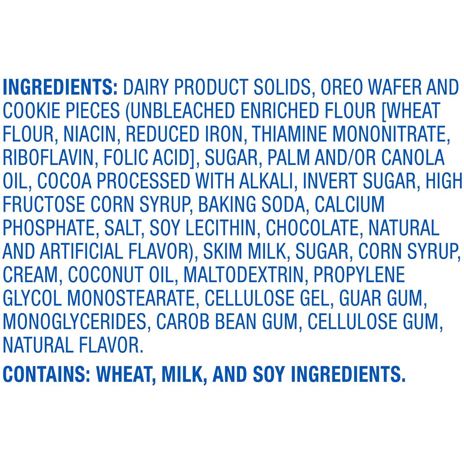 Ingredients: Dairy Product Solids, Oreo Wafer And Cookie Pieces (Unbleached Enriched Flour [wheat Flour, Niacin, Reduced Iron, Thiamine Mononitrate, Riboflavin, Folic Acid], Sugar, Palm And/or Canola Oil, Cocoa Processed With Alkali, Invert Sugar, High Fructose Corn Syrup, Baking Soda, Calcium Phosphate, Salt, Soy Lecithin, Chocolate, Natural And Artificial Flavor), Skim Milk, Sugar, Corn Syrup, Cream, Coconut Oil, Maltodextrin, Propylene Glycol Monostearate, Cellulose Gel, Guar Gum, Monoglycerides, Carob Bean Gum, Cellulose Gum, Natural Flavor.