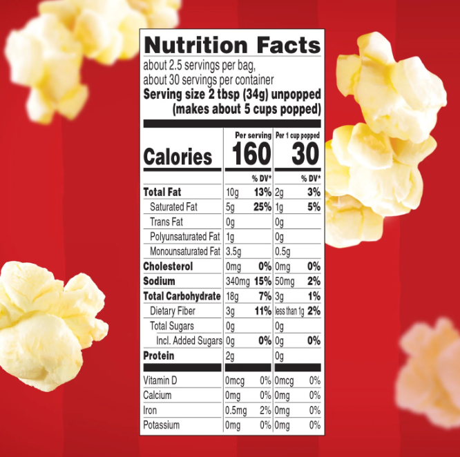 Whole Grain Popping Corn, Palm Oil, Salt, Natural Flavor (Including Milk), Rosemary Extract (For Freshness), Color Added (Annatto). CONTAINS: MILK.