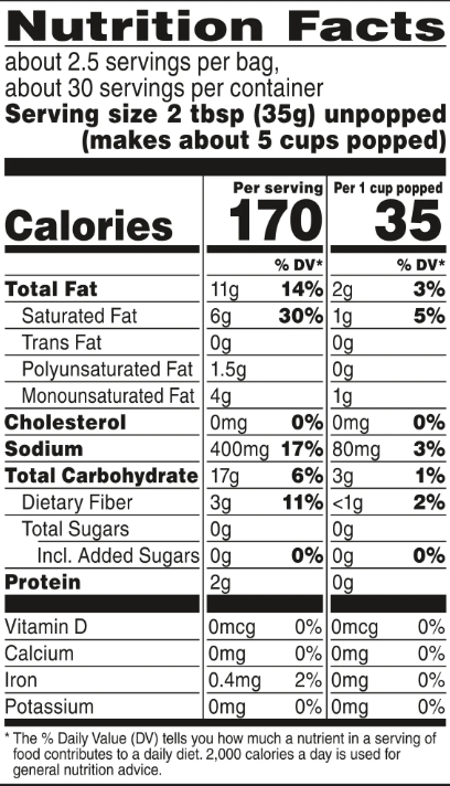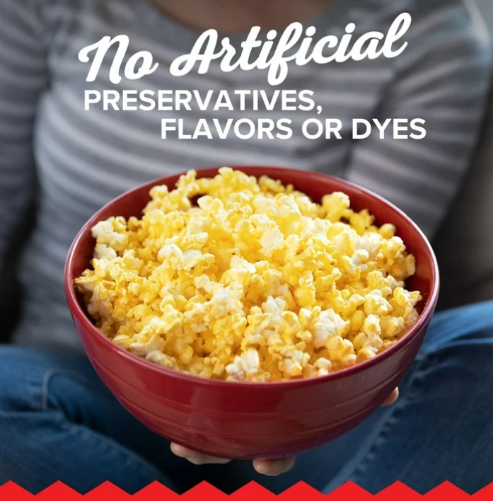 Whole Grain Popping Corn, Palm Oil, Salt, Natural Flavors (Including Milk), Mixed Tocopherols (Vitamin E for freshness), Color Added (Annatto). CONTAINS: MILK.