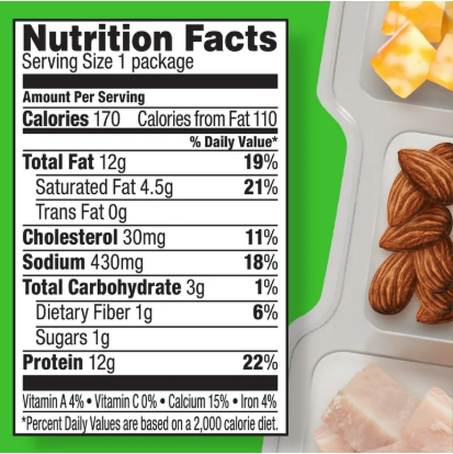 Snack-size portions of applewood smoked turkey breast, dry roasted almonds and colby jack cheese in a convenient single-serve tray