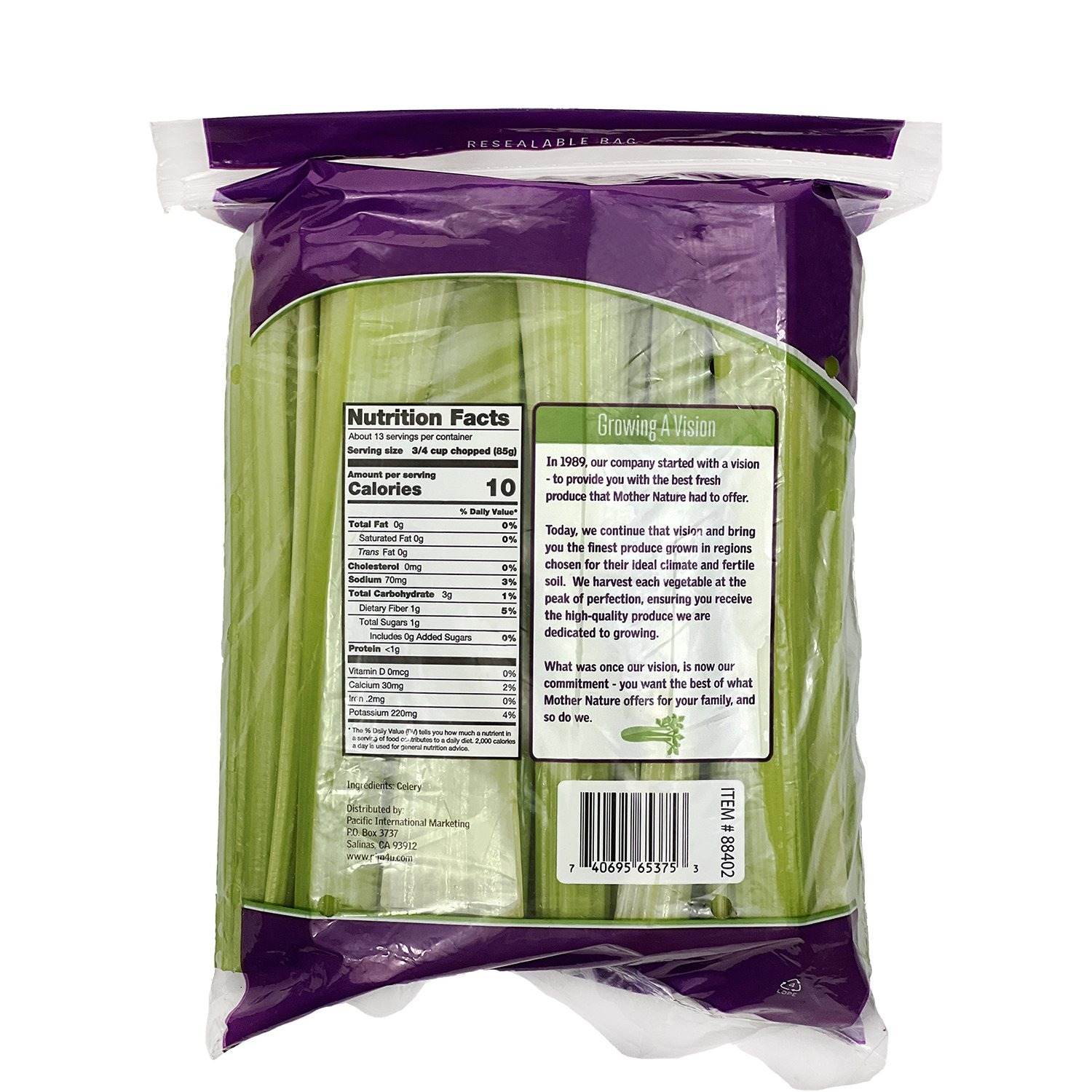 Pacific Celery Sticks are harvested at their peak and delivered straight from the fields. These pre-cut sticks are packaged in an easy-to-open 2.5-lb resealable bag for your convenience. To keep them fresh, store the celery sticks in the crisper drawer of your refrigerator, either in their original bag or with one end in water. Remember to rinse them thoroughly under running water before use.