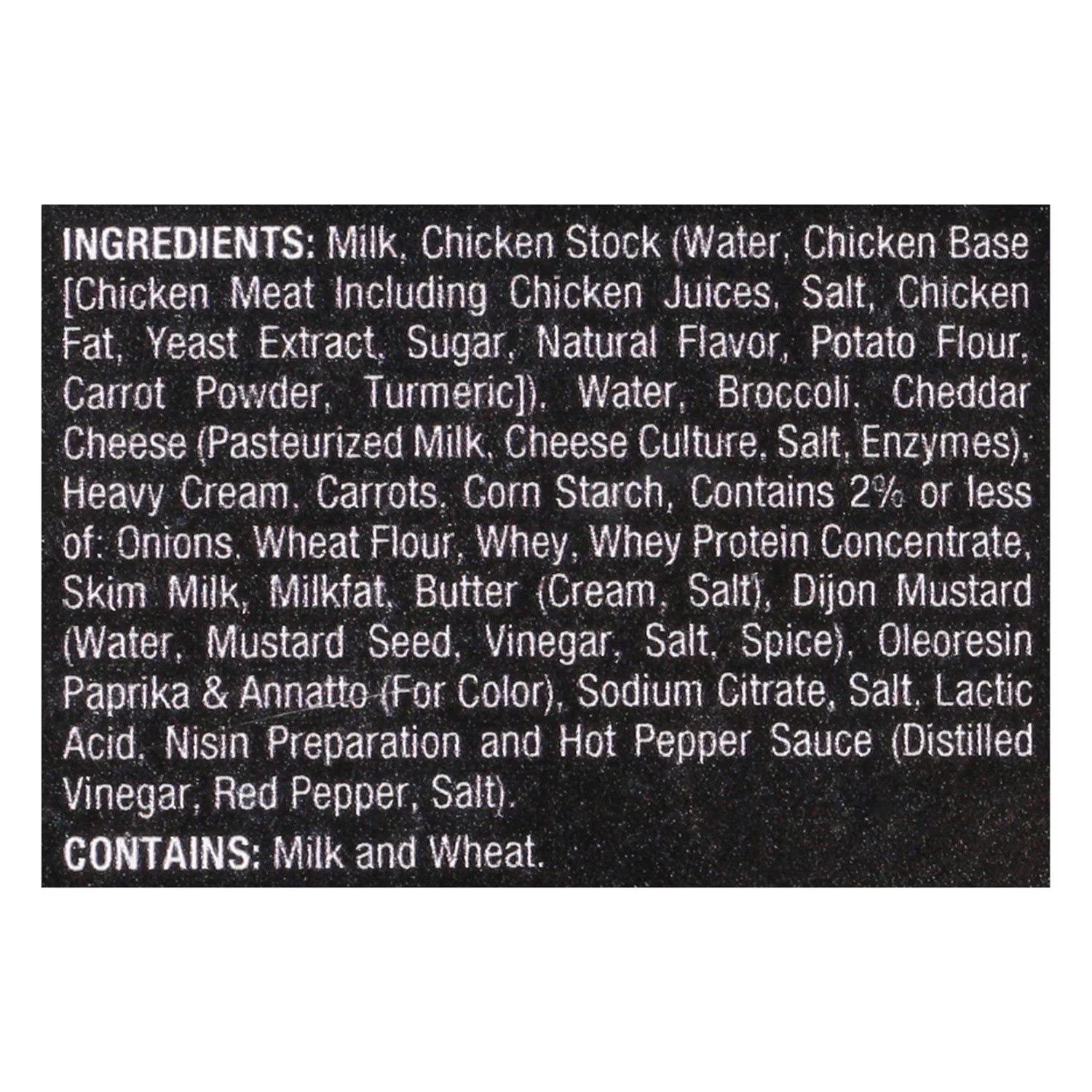 This delicious soup is made with chopped broccoli, shredded carrots and select seasoning. It's simmered in a velvety smooth cheese sauce.