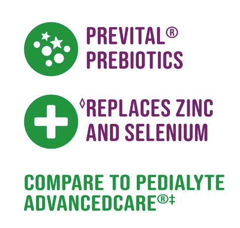 Compare to Pedialyte ADVANCEDCARE*, Parent's Choice Advantage® Care Electrolyte Solution in Orange flavor is a medical-grade hydration** solution designed to deliver a balance of sugar and electrolytes, formulated with PreVital Prebiotics to help promote digestive health. Includes zinc and selenium for immune support and helps to quickly replenish fluids, zinc, and electrolytes lost due to vomiting, diarrhea, exercise, heat exhaustion, or travel. Made with natural colors, flavors, and sweeteners, and free from artificial flavors, artificial sweeteners, or synthetic colors. This electrolyte solution helps prevent mild to moderate dehydration more effectively than common beverages like sports drinks, 100% apple juice, soda, and water. Pediatrician- and pharmacist-recommended, Advantage Care is great for kids and adults. For children under 1 year of age, consult your doctor. Certified kosher by the Orthodox Union – (U)D. *This product is not manufactured or distributed by the owner of the registered trademarks Pedialyte and Pedialyte ADVANCEDCARE. **Balance of sugar and electrolytes recommended by the American Academy of Pediatrics; Kleinman RE, 2019.