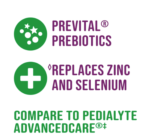 Compare to Pedialyte ADVANCEDCARE*, Parent's Choice Advantage® Care Electrolyte Solution in Strawberry Lemonade flavor is a medical-grade hydration** solution designed to deliver a balance of sugar and electrolytes, formulated with PreVital Prebiotics to help promote digestive health. Includes zinc and selenium for immune support and helps to quickly replenish fluids, zinc, and electrolytes lost due to vomiting, diarrhea, exercise, heat exhaustion, or travel. Made with natural colors, flavors, and sweeteners, and free from artificial flavors, artificial sweeteners, or synthetic colors. This electrolyte solution helps prevent mild to moderate dehydration more effectively than common beverages like sports drinks, 100% apple juice, soda, and water. Pediatrician- and pharmacist-recommended, Advantage Care is great for kids and adults. For children under 1 year of age, consult your doctor. Certified kosher by the Orthodox Union – (U)D. *This product is not manufactured or distributed by the owner of the registered trademarks Pedialyte® and Pedialyte ADVANCEDCARE®. **Balance of sugar and electrolytes recommended by the American Academy of Pediatrics; Kleinman RE, 2019.