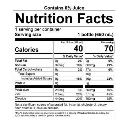 Purified Water, Dextrose, Less Than 2% of: Citric Acid, Potassium Citrate, Salt, Sodium Citrate, Natural Flavors, Rebaudioside A (from Stevia rebaudiana leaf extract), Zinc Gluconate