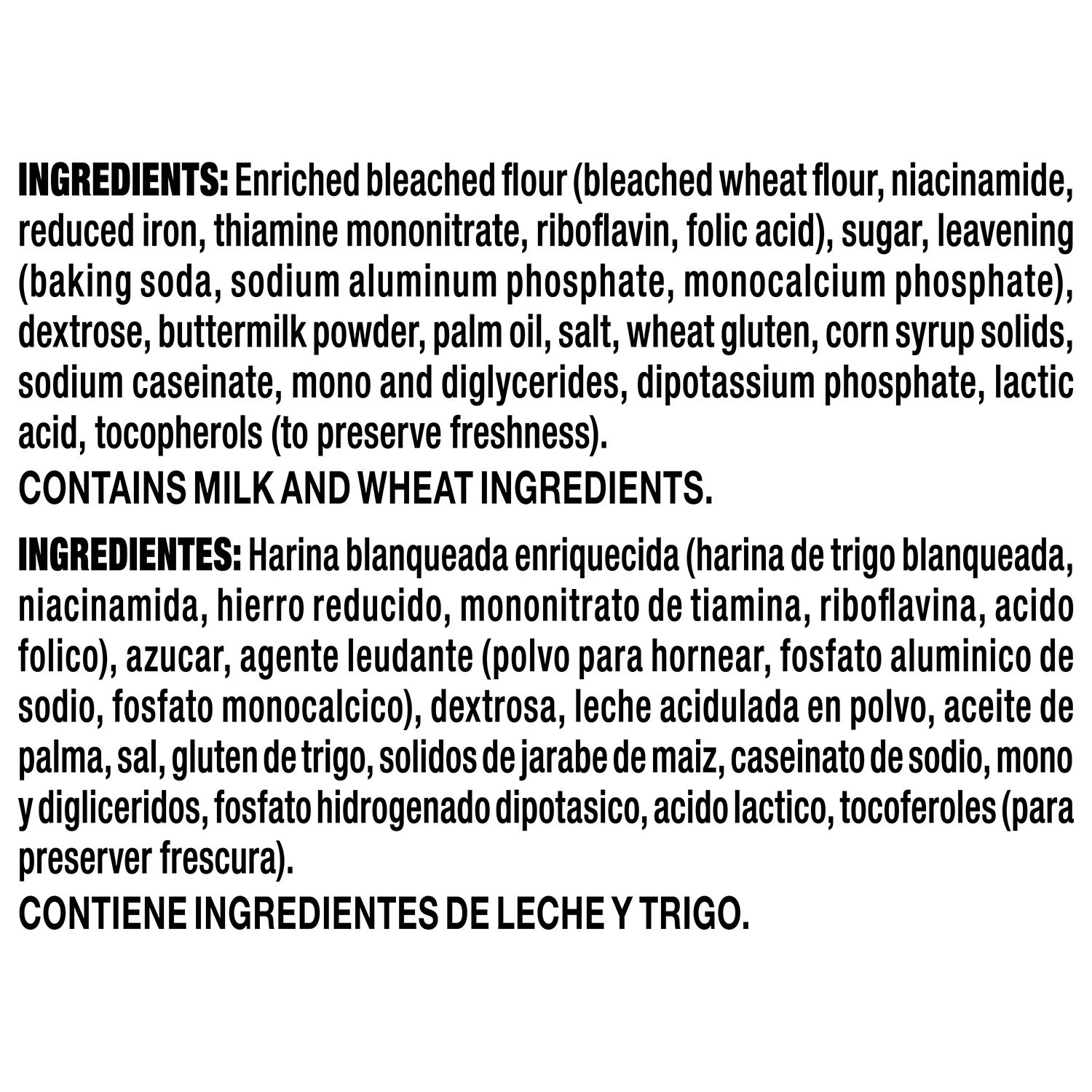 Ingredients: Enriched Bleached Flour (Bleached Wheat Flour, Niacinamide, Reduced Iron, Thiamin Mononitrate, Riboflavin, Folic Acid), Sugar, Leavening (Baking Soda, Sodium Aluminum Phosphate, Monocalcium Phosphate), Dextrose, Nonfat Dry Milk, Palm Oil, Salt, Wheat Gluten, Corn Syrup Solids, Sodium Caseinate, Mono And Diglycerides, Dipotassium Phosphate, Lactic Acid, Tocopherols (To Preserve Freshness). Contains milk and wheat ingredients.