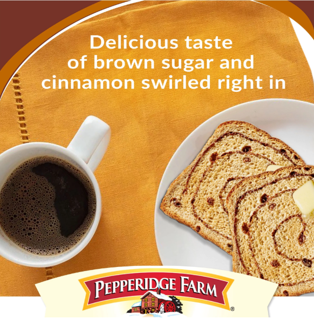 Welcome the day with a slice of Pepperidge Farm Brown Sugar Cinnamon Swirl Bread. Every slice of our golden-baked bread has the aroma and delicious taste of cinnamon swirled right in. It’s lightly sweetened with no artificial flavors or high-fructose corn syrup and sliced thick, perfect for toasting. Try it with butter or your favorite spread or use it for your favorite French toast recipe. For Pepperidge Farm, baking is more than a job. To us, it’s a real passion. Each day, our bakers take the time to make every cookie, pastry, cracker, and loaf of bread the best way they know how. They always start with carefully selected, quality ingredients that are blended and baked to perfection, ready to welcome you to your day. From our ovens to your breakfast table, it's the most delicious way to start your day! Shelf-stable product.