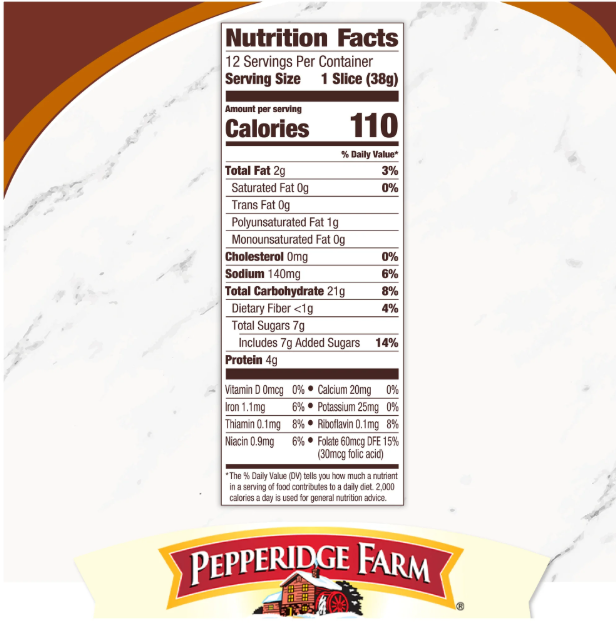 LOAF OF BROWN SUGAR CINNAMON SWIRL BREAD: Pepperidge Farm Brown Sugar Cinnamon Swirl Bread has 14 slices per loaf