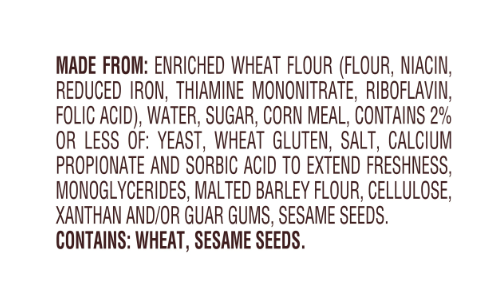 Made From: Enriched Wheat Flour (Flour, Niacin, Reduced Iron, Thiamine Mononitrate, Riboflavin, Folic Acid), Water, Sugar, Corn Meal, Contains 2% Or Less Of: Yeast, Wheat Gluten, Salt, Calcium Propionate And Sorbic Acid To Extend Freshness, Monoglycerides, Malted Barley Flour, Cellulose, Xanthan And/Or Guar Gums, Sesame Seeds. Contains: Wheat, Sesame Seeds.