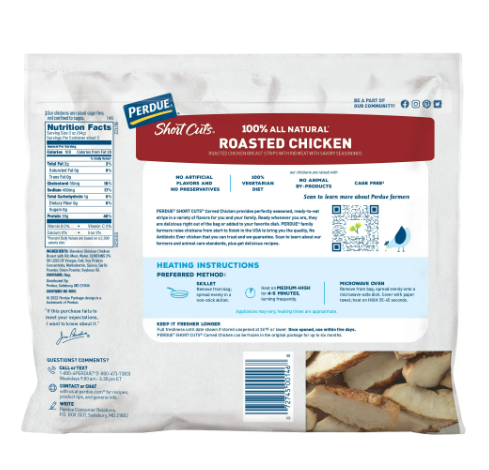 Experience The Best Tasting Chicken in the World™! The recipe for PERDUE® SHORT CUTS® Roasted Chicken Strips (16 ounces) starts with tender, juicy and delicious chicken breasts, which are perfectly seasoned with natural herbs and spices and then oven roasted to perfection. Kitchen time savers, chicken strips are fully cooked and ready to add to your favorite stir-fry, salad or appetizer recipes! These gluten-free chicken strips are packed with 20g protein per serving (3 oz). At PERDUE, we're hungry for better chicken and that means paying attention to all of the details, no matter how big or small. We believe our practices – like providing healthy feed and a happy environment for our chickens – lead to better-tasting chicken. And we think you’ll agree: take one bite and taste the difference that comes from our relentless pursuit of better-tasting chicken.