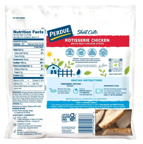 PERDUE® SHORT CUTS® Rotisserie-Style Chicken Breast Strips (8 ounces) are perfectly seasoned, fully cooked, fresh and ready to add to your favorite recipes. Simply add to soups, use as a pizza or salad topping and much more! These gluten-free chicken strips are delicious and packed with 20g protein per serving (3 oz). At PERDUE®, we're hungry for better chicken and that means paying attention to all of the details, no matter how big or small. We believe our practices – like providing healthy feed and a happy environment for our chickens – lead to better-tasting chicken. And we think you’ll agree: take one bite and taste the difference that comes from our relentless pursuit of better-tasting chicken.