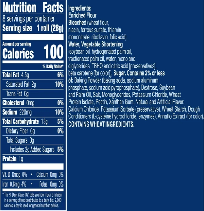 Enriched Flour Bleached (Wheat Flour, Niacin, Ferrous Sulfate, Thiamin Mononitrate, Riboflavin, Folic Acid), Water, Vegetable Shortening (Soybean Oil, Hydrogenated Palm Oil, Fractionated Palm Oil, Mono and Diglycerides, TBHQ and Citric Acid [Preservatives], Beta Carotene [for Color]), Sugar, Baking Powder (Baking Soda, Sodium Acid Pyrophosphate, Sodium Aluminum Phosphate), Contains 2% or Less of: Vital Wheat Gluten, Palm and/or Soybean Oil, Dextrose, Salt, Monoglycerides, Potassium Chloride, Natural and Artificial Flavor, Calcium Chloride, Potassium Sorbate (Preservative), L-Cysteine Hydrochloride (Dough Conditioner), Annatto Extract (for Color).