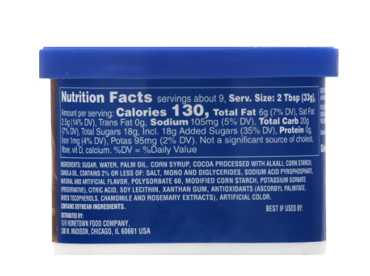 Sugar, Water, Palm Oil, Corn Syrup, Cocoa Processed with Alkali, Corn Starch, Canola Oil, Contains 2% or Less of: Salt, Mono and Diglycerides, Sodium Acid Pyrophosphate, Natural and Artificial Flavor, Polysorbate 60, Modified Corn Starch, Potassium Sorbate (Preservatives), Citric Acid, Soy Lecithin, Xanthan Gum, Antioxidants (Ascorbyl Palmitate, Mixed Tocopherols, Chamomile and Rosemary Extracts), Artificial Color.