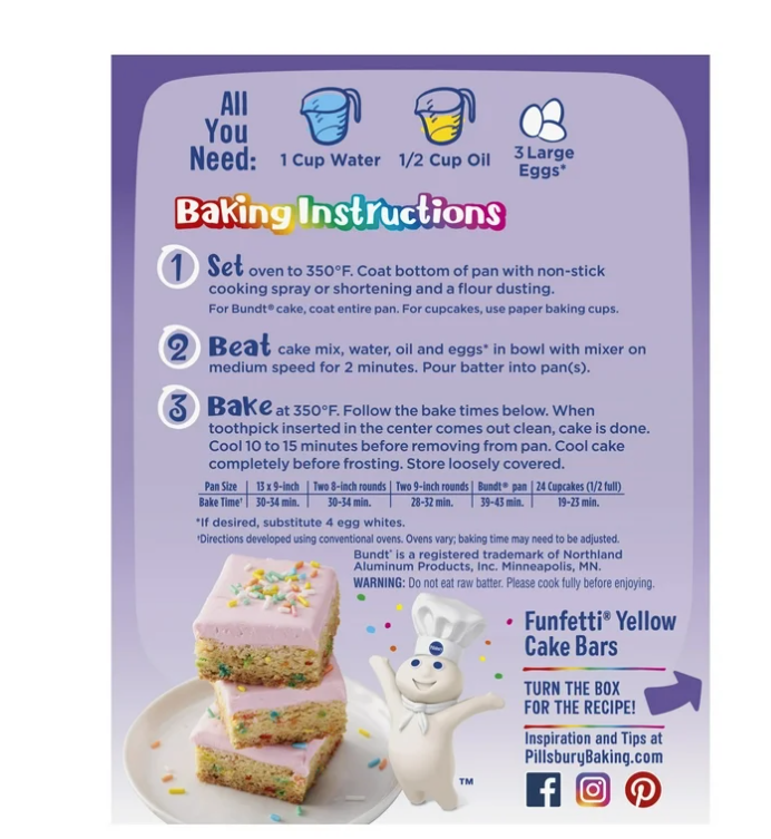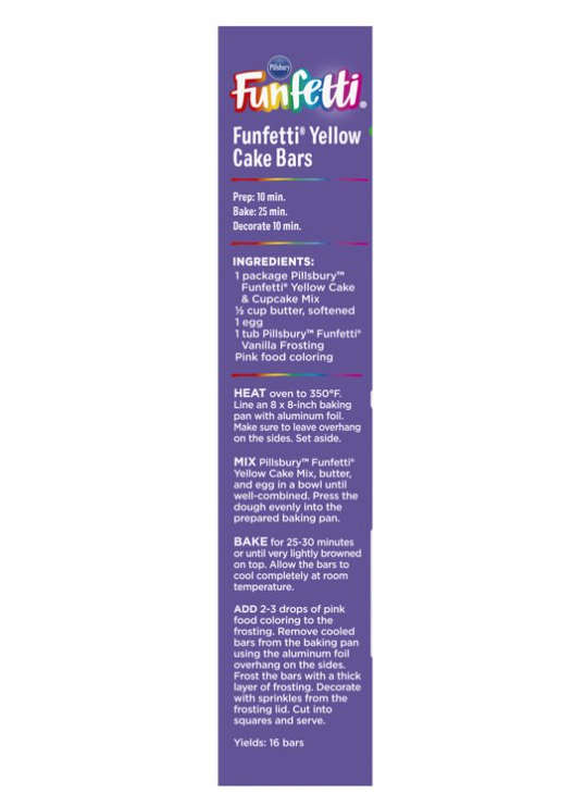 Easily prepare a delicious dessert with Pillsbury Funfetti Yellow Cake Mix. Pillsbury Funfetti cake mix delivers the classic taste of yellow cake with a moist texture and easy-to-follow instructions, plus the fun addition of colorful candy bits. Pillsbury Funfetti yellow cake mix contains all the dry ingredients you need to create delicious desserts at home in just three steps. Simply add water, vegetable oil and eggs to the dry baking mix, and stir to combine. After mixing the ingredients, bake your cake according to the time given on the box. This boxed cake mix makes enough batter for a 13 by 9 inch cake, two 8 inch round cakes or a standard Bundt cake. It can also be used as a cupcake mix to make up to 24 cupcakes. Decorate the cooled yellow cake with Pillsbury Funfetti frosting or make your own cake creations like cake pops or a trifle for an extra special treat. Pillsbury Funfetti Yellow Cake Mix is great for celebrations, an after dinner surprise or special occasions, big and small. The Funfetti cake mix comes in a 15.25 oz box that is easy to store in the pantry for a ready to prepare birthday cake. Pillsbury Funfetti cakes will take your next party or get-together to the next level. The Pillsbury Baking website has delicious and easy recipes, fun ideas and simple baking tips to help you and your family create tasty memories together.