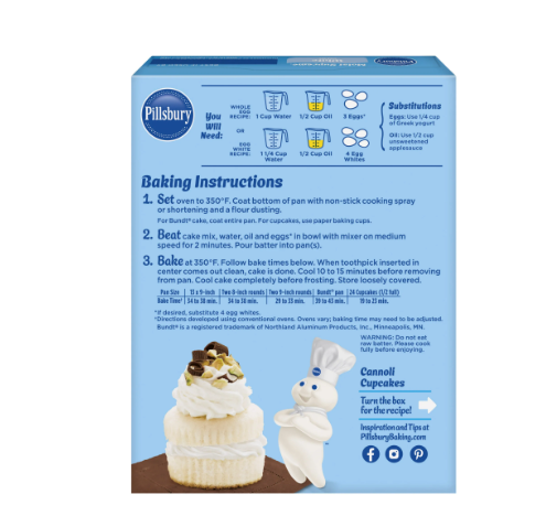 All You Need: **Whole Egg Recipe: **1/2 Cup oil **1 Cup water **3 Eggs* **Or **Egg White Recipe: **1/2 Cup oil **1 1/4 Cups water **4 Egg whites **Substitutions **Eggs: Use 1/4 cup of Greek yogurt **Or **Oil: Use 1/2 cup unsweetened applesauce **Baking Instructions **1. Set oven to 350°F. Coat bottom of pan with no-stick cooking spray or shortening and a flour dusting. **For Bundt® cake, coat entire pan. For cupcakes, use paper baking cups. **2. Beat cake mix, water, oil and eggs in bowl with mixer on medium speed for 2 minutes. Pour batter into pan(s). **3. Bake at 350°F. Follow the bake times below. When toothpick inserted in the center comes out clean, cake is done. Cool 10 to 15 minutes before removing from pan. Cool cake completely before frosting. Store loosely covered. ***If desired, substitute 1/2 cup egg substitute for the eggs. **Pan Size: 13 x 9-inch; Bake Time: 34 to 38 min. **Pan Size: Two 8-inch rounds; Bake Time: 34 to 38 min. **Pan Size: Two 9-inch rounds; Bake Time: 29 to 33 min. **Pan Size: Bundt® pan; Bake Time: 39 to 43 min. **Pan Size: 24 cupcakes (1/2 full); Bake Time: 19 to 23 min.