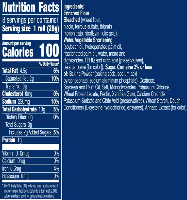 Enriched Flour Bleached (Wheat Flour, Niacin, Ferrous Sulfate, Thiamin Mononitrate, Riboflavin, Folic Acid), Water, Vegetable Shortening (Soybean Oil, Hydrogenated Palm Oil, Fractionated Palm Oil, Water, Mono and Diglycerides, TBHQ and Citric Acid [Preservatives], Beta Carotene [for Color]), Sugar, Baking Powder (Baking Soda, Sodium Acid Pyrophosphate, Sodium Aluminum Phosphate), Contains 2% or Less of: Vital Wheat Gluten, Palm and/or Soybean Oil, Dextrose, Salt, Monoglycerides, Potassium Chloride, Calcium Chloride, Potassium Sorbate (Preservative), L-Cysteine Hydrochloride (Dough Conditioner), Annatto Extract (for Color).