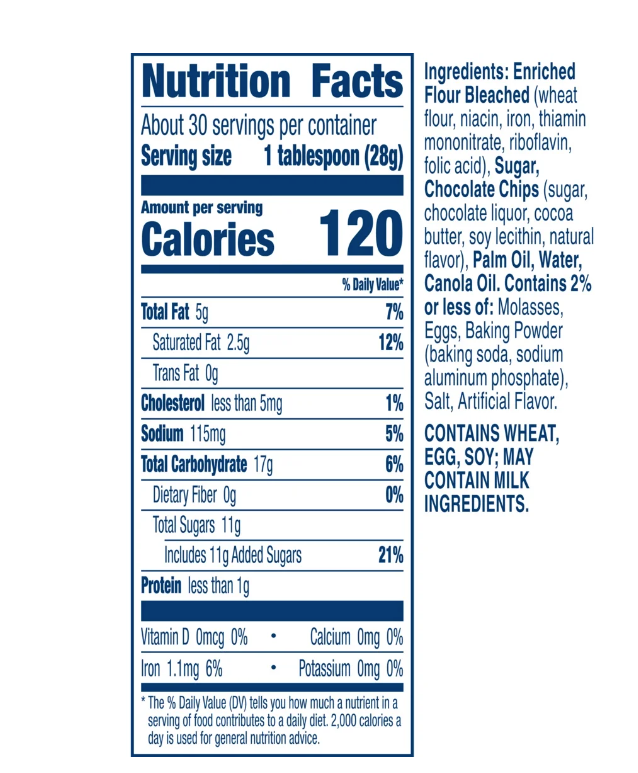Enriched Flour Bleached (Wheat Flour, Niacin, Iron, Thiamin Mononitrate, Riboflavin, Folic Acid), Sugar, Chocolate Chips (Sugar, Chocolate Liquor, Cocoa Butter, Soy Lecithin, Natural Flavor), Palm Oil, Water, Canola Oil. Contains 2% or Less of: Molasses, Eggs, Baking Powder (Baking Soda, Sodium Aluminum Phosphate), Salt, Artificial Flavor.