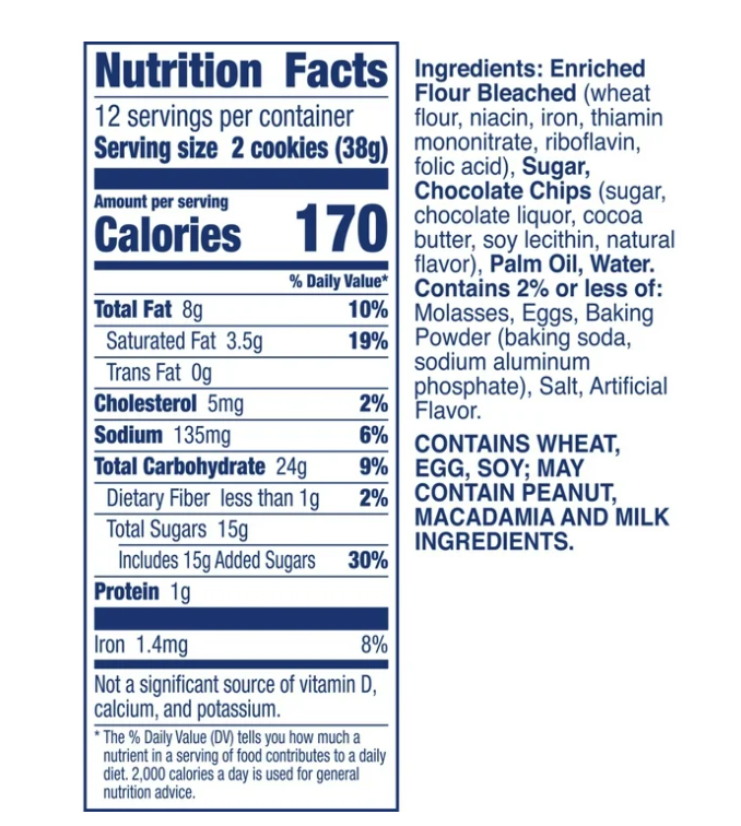 Enriched Flour Bleached (Wheat Flour, Niacin, Iron, Thiamin Mononitrate, Riboflavin, Folic Acid), Sugar, Chocolate Chips (Sugar, Chocolate Liquor, Cocoa Butter, Soy Lecithin, Natural Flavor), Palm Oil, Water, Contains 2% or Less of: Molasses, Eggs, Baking Powder (Baking Soda, Sodium Aluminum Phosphate), Salt, Artificial Flavor.