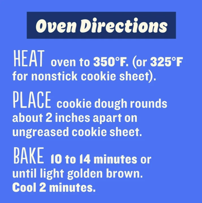 Keep Refrigerated. HEAT oven to 350°F (or 325°F for nonstick cookie sheet).PLACE cookie dough rounds about 2 inches apart on ungreased cookie sheet.BAKE 10 to 14 minutes or until light golden brown. COOL 2 minutes; remove from cookie sheet.Tip: If baking frozen dough, add 2 minutes to the bake time.