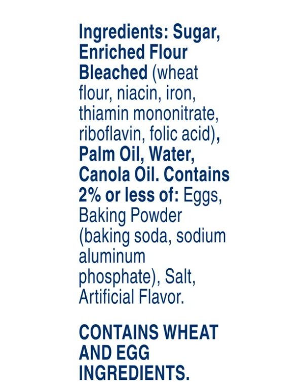Sugar, Enriched Flour Bleached (Wheat Flour, Niacin, Iron, Thiamin Mononitrate, Riboflavin, Folic Acid), Palm Oil, Water, Canola Oil, Contains 2% or Less of: Eggs, Baking Powder (Baking Soda, Sodium Aluminum Phosphate), Salt, Artificial Flavor.
