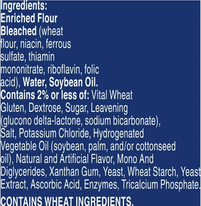 Enriched Flour Bleached (wheat flour, niacin, ferrous sulfate, thiamin mononitrate, riboflavin, folic acid), Water, Soybean Oil. Contains 2% or less of: Vital Wheat Gluten, Dextrose, Sugar, Leavening (glucono delta-lactone, sodium bicarbonate), Salt, Potassium Chloride, Hydrogenated Vegetable Oil (soybean, palm, and/or cottonseed oil), Natural and Artificial Flavor, Mono and Diglycerides, Xanthan Gum, Yeast, Wheat Starch, Yeast Extract, Ascorbic Acid, Enzymes, Tricalcium Phosphate.